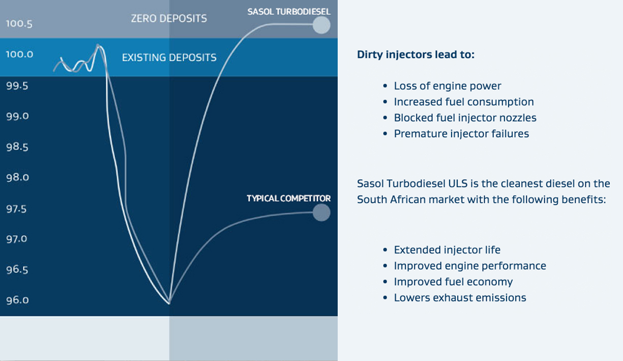 The graph below shows the engine test results of a comparison between Sasol Turbodiesel ULS and a typical competitor product.