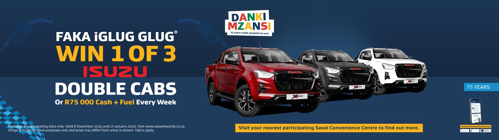 Enter with Sasol Rewards and you could drive away in an ISUZU double cab bakkie or take home R75 000 in cash plus fuel every week. Fill up for R500 or more and get an instant prize on the spot.