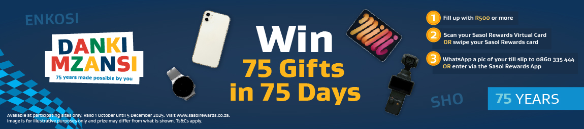 Sasol is 75! Fill up with R500 or more and stand a chance to win Smartphones, Tablets and so much more!